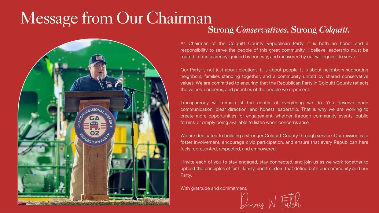 Community: We stand for Colquitt County, rooted in faith, hard work, and Southern values, working together to build a stronger, freer future for generations to come.